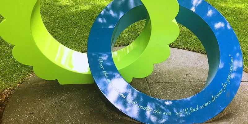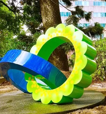 The vibrant sculpture “And on the third day flowering plants sprung from the earth,” by Brian Robinson, features two circular blooms eternally interconnected, referencing floral wreaths laid in loving memory at funerals; a mandola, an ancient symbol signifying divine light and sacred moments transcending space and time; and the above inscription, which many may remember from one of the murals that once decorated the walls of the RCH.